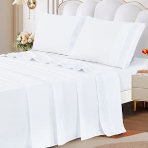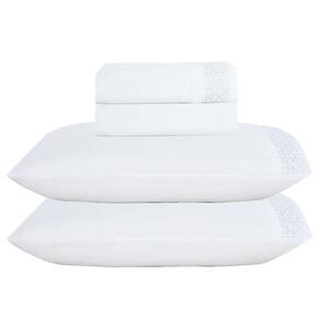 O Jogo de lençol para cama Queen com 04 peças confeccionado em tecido Percal 300 fios, detalhes bordado na fronha e no lençol de cima. Possui alto padrão de qualidade, proporciona conforto e sofisticação.