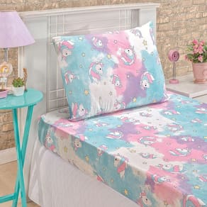 Especificações Produto: Jogo de lençol Tamanho: Solteiro Coleção: Diverkids Modelo: Unicórnio Cor: Rosa E Azul Composição do tecido: Malha com fio penteado 301 em 100% algodão Medidas do lençol: 1,88 m x 88 cm x 30 cm Medidas da fronha: 70 x 50 cm