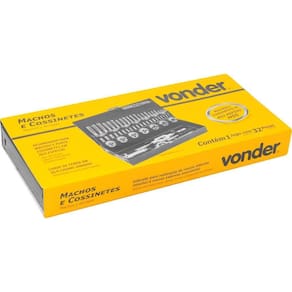 Ref.: do Fornecedor:5399032000Marca:VonderConteúdo da Embalagem:1 Jogo de machos e cossinetes composto por 1 estojo metálico com 32 peças, sendo: 7 cossinetes rosca MA de 1 25,4 mm 1 peça M3 x 0,5 mm - 1 peça M4 x 0,7 mm - 1 peça M5 x 0,8 mm - 1 peça M6 x 1,0 mm - 1 peça M8 x 1,25 mm - 1 peça M10 x 1,5 mm - 1 peça M12 x 1,75 mm , 21 machos rosca MA 3 peças M3 x 0,5 mm - 3 peças M4 x 0,7 mm - 3 peças M5 x 0,8 mm - 3 peças M6 x 1,0 mm - 3 peças M8 x 1,25 mm - 3 peças M10 x 1,5 mm - 3 peças M12 x 1,75 mm , 1 desandador vira-macho para macho N 1/M3 - M12, 1 desandador porta-cossinete para cossinetes de 1 25,4 mm, 1 chave de fenda 6,35 mm - 1/4 x 3 - 76 mm e 1 calibre de rosca composto por 12 lâminas M3 x 0,5 mm - M3,5 x 0,6 mm - M4 x 0,7 mm - M4 x 0,75 mm - M5 x 0,8 mm - M5 x 0,9 mm - M6 x 1 mm - M8 x 1,25 mm - M10 x 1,5 mm - M12 x 1,75 - NPT 27 - BSP 28 fios .Destaques e diferenciais:Machos e cossinetes produzidos em aço rápido, proporcionando maior resistência e durabilidade.Aplicações e dicas de uso:Indicado para realização de roscas internas utilizando a ferramenta macho em conjunto com o vira-macho. Além da realização de roscas externas utilizando a ferramenta cossinete em conjunto com o porta-cossinetes. Possibilita a medição de roscas através do cálibre de rosca.Características Técnicas:Material: Machos e cossinetes: Aço rápido HSS / Desandador para machos e porta cossinetes: Aço especial / Chave de fenda: Aço cromo vanádio.