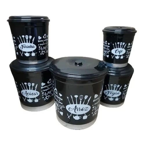 Feitos em alumínio , os potes para mantimentos ajudam você a manter seus alimentos guardados por mais tempo e mantém a sua cozinha sempre organizada. O conjunto é comporto por 5 peças de tamanhos diferentes decorado. É prático e funcional, possui caixa própria.