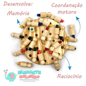 Como jogar - para jogar de 1 a 4 jogadores. Insira os pinos de madeira no quadro aleatoriamente com as cores ocultas e tente lembrar o cor de cada um deles. O jogador lança o dado e tenta achar um pino da cor numa única chance. Acertou, guarda o pino e joga novamente. Errou, passa a vez para o próximo jogador, ganha quem acaba o jogo com mais pinos.