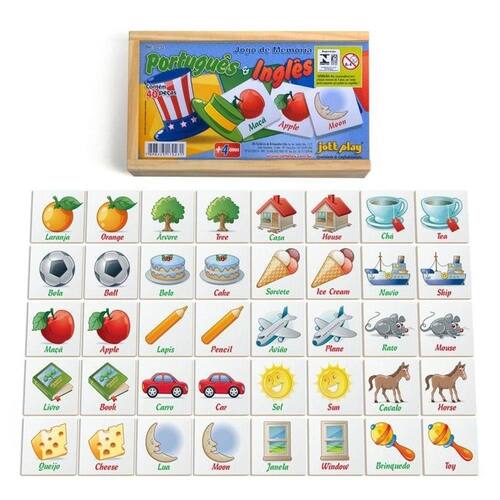 Jogo de memória educativo Inglês e Português, composto por 40 peças em MDF com figuras "vivas e coloridas" das palavras e suas imagens, visando que a criança associe os "pares" em cada língua idioma num processo lúdico de aprendizagem. Acondicionados em caixa de madeira medindo 22x12x4cm. CE-BRI/ICEPEX - N 00928-96