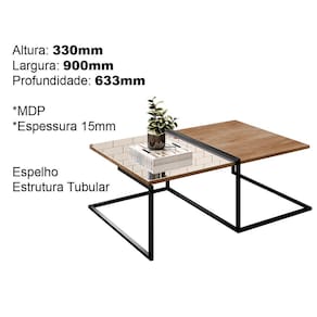 A Mesa de centro Aurora, é repleta de sofisticação e elegância, com um espelho no tampo que oferece ao produto mais amplitude de reflexão e traz muito requinte, tampo em BP de 15mm que oferece ao produto mais resistência à umidade, riscos, mofo e bactéria, e este super material ainda viabiliza valores mais naturais em seu visual que remetem aos desenhos de madeiras naturais, estruturas em metal antioxidantes com pintura eletrostática.