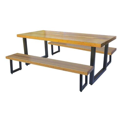 Madeira Maciça Formato: Retangular Material do Tampo: Madeira Nobre e Maciça Material dos Assentos: Madeira Nobre e Maciça Material dos Pés: Ferro Acabamento dos Pés: Pintura Epóxi Eletrostática Nivelamento dos Pés: Sim