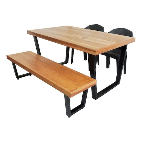 O JOGO MESA, BANCO E 2 CADEIRAS possui tampo e assentos em MADEIRA MACIÇA e BASE METÁLICA com pintura Epóxi Eletrostática que garante durabilidade e acabamento diferenciado ao produto, dando ar de modernidade e sofisticação à sua casa.