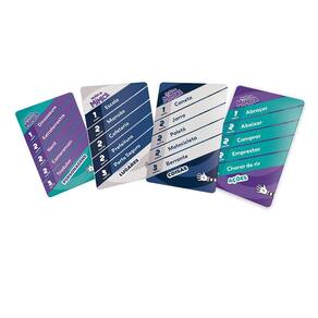 O jogo inclui 180 cartas temáticas de 56mm x 87mm com sugestões para mímicas criativas e uma ampulheta de 6,7 cm x 3,5 cm para cronometrar o tempo das rodadas.