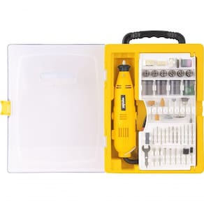 1 Microrretífica, composta por um estojo plástico com 174 acessórios, sendo: 12 lixas cilindro, 1 roda de pano, 3 rodas de feltro, 1 ponta de feltro, 1 roda de borracha, 2 brocas de aço rápido de 1,6 mm, 1 broca de aço rápido de 2,4 mm, 1 broca de aço rápido de 3,2 mm, 2 hastes para lixa cilindro, 5 limas rotativas diamantadas, 2 limas rotativas, 3 pontas montadas de óxido de alumínio, 3 rebolos de óxido de alumínio, 2 pontas montadas de carbureto de silício, 3 rebolos de carbureto de silício, 3 escovas de inox, 1 pasta para polimento, 74 discos de corte, 44 discos de lixa, 2 pinças de 3,2 mm, 1 pinça de 2,4 mm, 1 pinça de 1,6 mm, 1 haste para disco de corte, 1 haste para disco de borracha, 1 haste para disco de feltro, 1 haste para disco de lixa, 1 chave de 9,5 mm para microrretífica e 1 bastão abrasivo