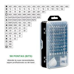 O conjunto de ferramentas kokay, com 115 peças, foi especialmente desenvolvido para atender a trabalhos de reparos técnicos que exigem precisão e qualidade . É a escolha ideal para quem busca eficiência e versatilidade em um único estojo. Especificações técnicas: - material: aço cromo vanádio - estojo compacto e funcional - aplicações: ideal para o reparo de celulares, laptops, relógios de pulso, óculos entre outros Tipos de pontas: - torx: t12, t22, t32, t42, t52, t62, t72, t82, t92, t102, t152, t202 - allen: 0.7, 0.9, 1.0, 1.3, 1.5, 2.0, 2.5, 3.0, 3.5, 4.0 - phillips: ph00002, ph0002, ph002, ph02, ph12, ph22 - fenda: 1.02, 1.32, 1.52, 2.02, 2.52, 3.0, 3.5, 4.0 - pentalobe: 0.82, 1.22, 1.52, 2.02 - pozidrive: pz000, pz00, pz0, pz1, pz2 - quadrada: sq0, sq1, sq2 - triangular: 2.0, 2.3, 2.7, 3.0 - tipo u: u2.3, u2.6 - tipo y: 0.62, 1.52, 2.0, 2.3, 3.0 - sim - soquete sextavado: m2.5, m3.0, m3.5, m4.0, m4.5, m5.0, m5.5 - ph2 Acessórios incluídos: - 1 cabo ergonômico - 1 haste de extensão flexível - 1 barra de extensão - 1 pinça - 3 alavancas abs - 1 pino de remoção de cartão sim - 1 ventosa - 6 palhetas de abertura - 1 magnetizador/desmagnetizador - 1 adaptador de para 4mm
