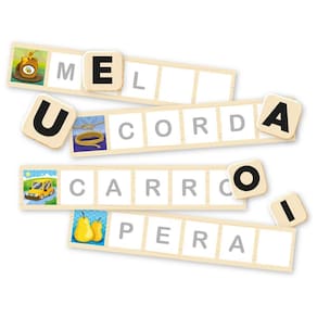 Escolha uma cartela com uma palavra e use as letras de madeira para montá-la. Depois, embaralhe as letras e forme novas palavras, dizendo-as em voz alta. A brincadeira fica ainda mais divertida com outra criança, revezando ou competindo para ver quem forma mais palavras. Os pais podem ajudar e estimular cada descoberta!