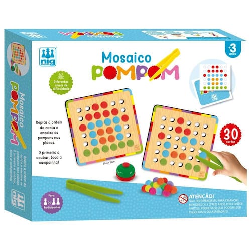 O Jogo Mosaico Pompom é uma atividade envolvente e divertida, projetada para estimular o desenvolvimento essencial das crianças. Com ele, os pequenos vão aprimorar a coordenação motora fina, a concentração e a memória de forma lúdica, seguindo os princípios da metodologia Montessori. O Jogo Mosaico Pompom, fabricado pela renomada marca Nig, é um jogo que estimula o desenvolvimento da coordenação motora fina, concentração e memória através de uma atividade Montessori, elaborado com placa de madeira e pompons e projetado para repetir as ordens dos pompons, de acordo com a carta sorteada, utilizando uma pinça para colocá-los. Este jogo é ideal para crianças em fase de desenvolvimento e também é uma excelente ferramenta para atividades educativas e lúdicas em casa ou na escola.