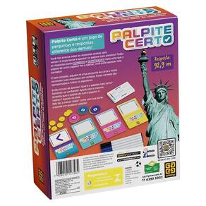 Palpite Certo é um jogo de perguntas e respostas diferente dos demaisVocê não precisa saber as respostas exatas para vencer. O importante é apostar no palpite mais próximo Todas as respostas serão NÚMEROS e QUANTIDADES Caso ache que o palpite de outro jogador foi o melhor, você pode apostar nele tambémÉ bem simples: alguém lê uma pergunta da carta e todos escrevem suas respostas em cartelas. Essas cartelas são apresentadas a todos os jogadores.Então é hora de apostar Qual é o palpite mais certo Sentindo-se confiante Aposte em si mesmo. Acredita que o palpite de outro jogador é melhor Aposte no dele. Não faz a menor ideia Conte com sua sorte e aposte em qualquer palpiteIdade: A partir de 8 anosParticipantes: De 3 a 6 Homologação Inmetro: CE-BRI/IQB 002320 54590/21-061 Marca: Não Informado