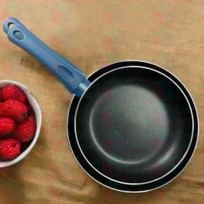 panelas com cabo e duas frigideiras, todos em alumínio com revestimento