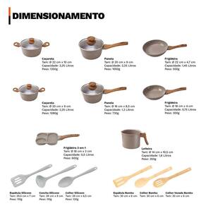 Distribuído por feheros shop Jogo de panelas 11 peças 4mm revestimento cerâmico premium indução Atenção As panelas com revestimento cerâmico possuem propriedades antiaderentes, mas não são 100% antiaderentes. Para melhores resultados, recomenda-se o uso de pequenas quantidades de óleo. O revestimento cerâmico é uma alternativa saudável e ecológica, pois não libera substâncias tóxicas quando aquecido. - panelas premium com certificação inmetro nível a - não deixe a chama do fogão pegar nas laterais das panelas - leia atentamente a descrição e siga as recomendações do fabricante Informações do produto Este conjunto completo oferece versatilidade e sofisticação para a sua cozinha. Compatível com todos tipos de fogão, inclusive por indução, suas peças são fabricadas com revestimento cerâmico de alta qualidade, que garante durabilidade, resistência e maior segurança alimentar. Livre de pfoa e ptfe, é uma opção saudável e sustentável. O design moderno com acabamento premium valoriza o ambiente e proporciona aquecimento rápido e uniforme, otimizando o tempo de preparo e reduzindo o consumo de energia. Especificações técnicas - compatível com fogões a gás, elétricos, vitrocerâmicos e de indução - revestimento cerâmico em 3 camadas com espessura de 4 mm - cabo de baquelite com revestimento soft touch, confortável e seguro - livre de pfoa e classificado como nível a no inmetro - fundo triplo com base de indução: estrutura que combina alumínio e revestimento cerâmico - revestimento: 2 camadas cerâmicas + 1 camada resistente a alta temperatura Ficha técnica do produto - panela 16 cm: d 16 cm x a 8,5 cm c 1300 ml p 730 g - panela 20 cm: d 20 cm x a 9 cm c 2250 ml p 1050 g - caçarola 20 cm: d 20 cm x a 9 cm c 2250 ml p 1080 g - caçarola 22 cm: d 22 cm x a 10 cm c 3250 ml p 1350 g - leiteira 14 cm: d 14 cm x a 10,5 cm c 2000 ml p 350 g - frigideira 18 cm: d 18 cm x a 4 cm c 750 ml p 300 g - frigideira 22 cm: d 22 cm x a 4,7 cm c 1450 ml p 500 g - frigideira grill 3 em 1: 18 x 18 cm x a 2 cm p 600 g - colher silicone 29 cm: 29 cm x l 6,5 cm p 120 g - concha silicone 29 cm: 29 cm x l 9 cm p 110 g - espátula vazada silicone 29,5 cm: 29,5 cm x l 7 cm p 110 g Importante: d = diâmetro, a = altura, c = capacidade, p = peso Antes do primeiro uso - lave com esponja macia e detergente - seque com pano macio - aplique um pouco de óleo na parte interna - leve ao fogo baixo por 2 minutos - desligue o fogo e espere esfriar - lave novamente e seque Após o uso - evite choques térmicos. Deixe esfriar antes de lavar - lave à mão com água morna, esponja macia e detergente - enxágue e seque com pano macio - para alimentos queimados, deixe de molho e lave - não utilize utensílios metálicos, objetos afiados ou produtos abrasivos Itens inclusos no pacote - 01 panela 16 cm com tampa de vidro - 01 panela 20 cm com tampa de vidro - 01 caçarola 20 cm com tampa de vidro - 01 caçarola 22 cm com tampa de vidro - 01 leiteira 14 cm - 01 frigideira 18 cm - 01 frigideira 22 cm - 01 frigideira grill 3 em 1 18cm - 01 colher silicone 29 cm premium - 01 concha silicone 29 cm premium - 01 espátula vazada silicone 29,5 cm premium acompanha - 01 espátula vazada de bambu - 01 colher vazada de bambu - 01 colher para arroz de bambu Todas as fotos são reais dos produtos. Qualquer dúvida, estamos à disposição Dúvidas frequentes 01 - o produto pode ir ao forno R: não, este conjunto não é adequado para uso no forno devido ao cabo em baquelite 02 - o produto é novo Possui 03 - é compatível com fogão de indução R: sim, o conjunto possui fundo especial que permite o uso em fogões de indução, além de fogões a gás, elétricos e vitrocerâmicos