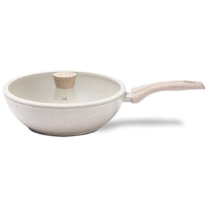 As panelas têm revestimento antiaderente pro ceramic e pintura externa siliconada na cor vanilla. Os cabos e o poméis são com acabamento soft-touch e efeito amadeirado. As tampas flat são em vidro com borda de silicone e saída de vapor.