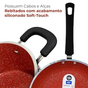 As panelas e caçarolas possuem cabos de baquelite Soft-Touch pretos, que dão um toque macio e não esquentam, evitando acidentes na cozinha. Além disso, o kit acompanha três utensílios de silicone, uma concha, uma espátula e uma colher, que são perfeitos para o preparo dos alimentos.