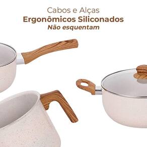 As peças do conjunto possuem cabos e alças com acabamento siliconado Soft-Touch amadeirado, que dão um toque macio e não esquentam, evitando acidentes.
