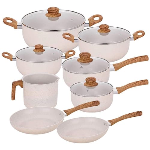 O Conjunto Casambiente 8 peças é indicado para fogões a gás, vitrocerâmico ou elétrico, é composto por três caçarolas, duas panelas com cabo, duas frigideiras e uma leiteira, todos em alumínio na cor vanilla com revestimento cerâmico marble.