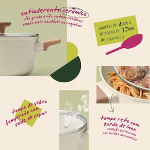resistentes e modernas, são perfeitas para fazer suas receitas favoritas! elas têm antiaderente cerâmico de alto desempenho: evitam que os alimentos grudem e são livre de toxinas! as panelas são forjadas: o processo confere maior durabilidade, distribuição de calor mais uniforme e melhora na retenção de calor, permitindo que a panela aqueça rapidamente e mantenha a temperatura.