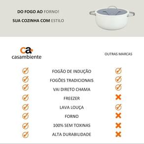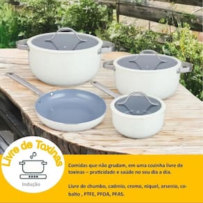 Vantagens: Revestimento cerâmico Antiaderente e livre de PFOA Alumínio reforçado Aquecimento rápido e uniforme Cabos resistentes Firmeza e segurança no manuseio Tampas encaixáveis Retenção ideal de calor e umidade Cor branca Ajusta-se a qualquer estilo de decoração