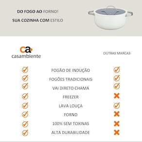 Vantagens: Revestimento cerâmico Antiaderente e livre de PFOA Alumínio reforçado Aquecimento rápido e uniforme Cabos resistentes Firmeza e segurança no manuseio Tampas encaixáveis Retenção ideal de calor e umidade Cor branca Ajusta-se a qualquer estilo de decoração