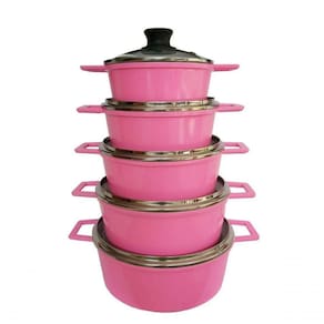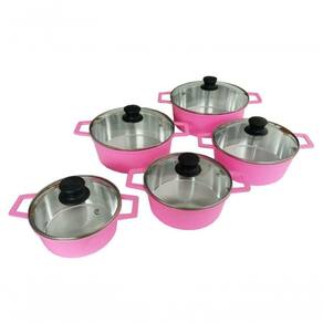 Jogo com 5 panelas de alumínio batido fundido com pintura Rosa com 3 camadas de verniz para maior proteção e brilho, com tampas de vidro temperado.