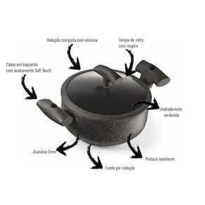 Características: Espessura de 3 milímetros, tampa de vidro com acabamento em silicone, além de muito bonita causa impressão de sofisticação na cozinha. Os cabos em silicone soft touch dão maciez e estabilidade no manuseio da panela além de serem isotérmicos e não esquentarem. O Interior antiaderente em cerâmica facilita o preparo e a limpeza além de não liberar componentes tóxicos na preparação dos alimentos, a construção da panela com fundo especial possibilita sua utilização.