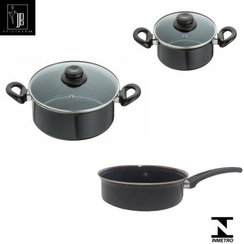 Jogo De Panelas Esmaltado para Fogão De Indução, Elétrico, á Gás, Elétrico, Cooktop e a Lenha Panelas com revestimento vitro-cerâmico. Mais segurança e economia para sua casa.Conjunto de panelas esmaltada 3 peças com tampa de vidro e aro de inox, design moderno e prático, que facilita o manuseio e a limpeza, não soltam resíduos, como panelas de alumínio, teflon e ferro.Com revestimento esmaltado ela é mais durável e higiênica, não transmitindo gosto ou odores, mantendo o verdadeiro sabor.Superfície lisa, adequado para todos os tipos de fogões.São próprias para fogão de indução, a gás, elétrico e fogão a lenha, podendo ir ao freezer e a lava-louça para facilitar sua experiência na cozinha do dia a dia.Este produto produzido em aço e é revestido por dupla camada de esmalte, sendo assim mantendo o calor por mais tempo, cozimento rápido, economizando até 30% de gás. 3 unidades que possuem alças reforçadas e confortáveis mantendo sempre um padrão elegante.Recomenda-se cozinhar sempre em fogo baixo.Sua vida útil pode ser prolongada ainda mais, se for utilizado utensílios de plástico, madeira ou silicone. Itens Inclusos:1 panela 18cm 1,750ml1 panela 20cm 2,150ml1 frigideira 20cm1 Tampa 18cm1 tampa 20cmNÃO POSSUI ANTIADERENTEEspecificações técnicasMarca: JJB UtilidadesModelo: EsmaltadaCor: PretoMaterial: Aço Carbono com revestimento em vitro-cerâmicaAmbientes Recomendados: CozinhaGarantia: 3 meses defeito de Fabricação.