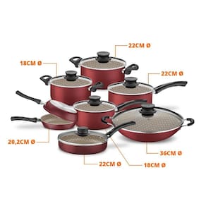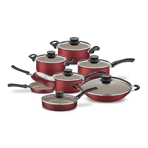 Componentes do Kit: - 1 Caçarola 18 cm 2,1 L Paris - 1 Caçarola 20 cm 2,9 L Paris - 1 Panela 18 cm 2,1 L Paris - 1 Panela 20 cm 2,9 L Paris - 1 Omeleteira 20,2 cm Loreto - 1 WOK 36 cm 6,0 L Paris - 1 Frigideira 22 cm 1,7 L Turim - Corpo de alumínio com espessura que proporciona cozimento rápido e uniforme. - Revestimento interno e externo de antiaderente Starflon Max que não gruda, é fácil de limpar, mais durável e não é prejudicial à saúde, pois é livre de PFOA. - Tampas de vidro temperado, com saída de vapor e bordas de aço inox. - Cabos, alças de baquelite antitérmico e pegadores de nylon que oferecem segurança durante o manuseio. - Podem ir à máquina de lavar louças facilitando seu dia a dia. Para preparar suas refeições do dia a dia, é indispensável que você conte com um item que lhe garanta praticidade e versatilidade, como a panela Tramontina em alumínio com revestimento interno e externo em antiaderente Starflon Max vermelho. Produzida em alumínio com revestimento interno e externo em antiaderente Starflon Max, ela garante o cozimento rápido e uniforme dos alimentos, evita que eles grudem em sua superfície e proporciona uma limpeza muito mais fácil. Ela possui tampa de vidro temperado com saída de vapor e borda de aço inox, que facilita a visualização dos alimentos e facilita seu preparo. Seu cabo ou alças são em baquelite antitérmico e o pegador da sua tampa é em nylon, dois materiais antitérmicos que proporcionam um manuseio muito mais seguro e confortável, pois não esquentam. Uma panela que pode ser levada à máquina de lavar louças e que vai otimizar sua rotina na cozinha : 90 dias para vícios ou defeitos de fabricação. Mais informações: - Tipo: Conjunto de panelas - Cor: Vermelho - Revestimento: Antiaderente Starflon Max - Fogão: Gás, Elétrico, Vitrocerâmico - resistência elétrica - Máquina de lavar: Sim Medidas do jogo embaladas: 48 cm A x 47 cm L x 30 cm P Peso líquido: 7,3 kg Peso bruto: 7,5 kg