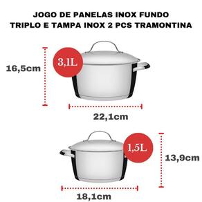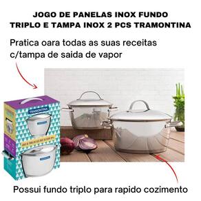 O Jogo de Panelas Tramontina Allegra em Aço Inox com Fundo Triplo e Tampas de Inox 2 Peças auxilia você no preparo das melhores receitas. Produzidas totalmente em aço inox, as duas peças trazem ainda a tecnologia de fundo triplo aço inox + alumínio + aço inox que distribui o calor uniformemente, proporcionando um cozimento mais rápido e uniforme, economizando energia e deixando os alimentos aquecidos por mais tempo. São fáceis de limpar devido ao desenho sem cantos, além de poderem ir à máquina de lavar louças diariamente. Além disso, são estilosas, possuem um moderno acabamento em alto brilho e possuem tampa com saída de vapor e encaixe perfeito. Altamente versáteis, podem ser utilizadas em diversos tipos de fogões. Um jogo com a qualidade Tramontina, que você já conhece e confia