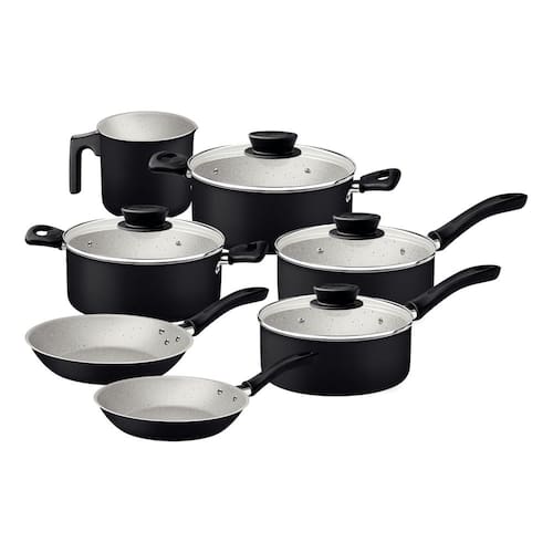 Adicione praticidade e eficiência à sua cozinha com o jogo de panelas Tramontina Linz em alumínio com revestimento interno e externo em antiaderente Starflon Max preto 7 peças. Cada peça é feita de alumínio, garante um cozimento rápido e uniforme, e impede que os alimentos grudem, facilitando a limpeza e proporcionando maior durabilidade. Com tampas de vidro temperado e bordas de aço inox, ela oferece maior visibilidade durante o preparo, enquanto seus cabos e alças de baquelite antitérmico e os pegadores de nylon garantem segurança e conforto no manuseio. As peças são versáteis e compatíveis com fogões a gás, elétricos e vitrocerâmicos, além de poderem ir à máquina de lavar louças, trazendo toda a funcionalidade que o preparo das suas refeições e você merecem!