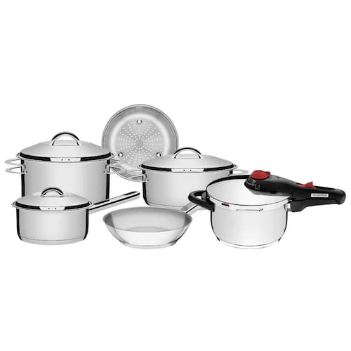 Acompanha panela de pressão, com ela você pode preparar todas as suas receitas com muita tranquilidade. A Panela de Pressão Tramontina em Aço Inox Fundo Triplo 22 cm de diâmetro 4,5 L, contando com 5 dispositivos de segurança que trabalham de forma integrada. Com a Panela de Pressão Tramontina da linha Solar não haverá mais desculpas para não preparar aquele feijão delicioso. Para facilitar ainda mais o uso, ela vem com medidores de capacidade internos, para você não errar na quantidade. O fundo triplo (aço inox + alumínio + aço inox) distribui o calor uniformemente, proporcionando um cozimento mais rápido e uniforme, economizando energia e deixando os alimentos aquecidos por mais tempo.