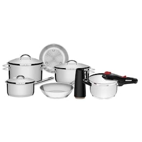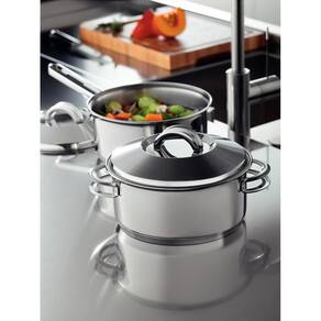 Nada como produtos duráveis e práticos na nossa cozinha. Com o Jogo de Panelas Tramontina Solar em Aço Inox com Fundo Triplo e Tampas de Inox 7 Peças você vai ter peças funcionais perfeitas para auxiliar você nas tarefas do dia a dia. Totalmente produzidas em aço inox, as cinco peças mantém os alimentos saudáveis já que o material não solta resíduos. Trazem ainda a tecnologia de fundo triplo (aço inox + alumínio + aço inox) que distribui o calor uniformemente, proporcionando um cozimento mais rápido e uniforme, economizando energia e deixando os alimentos aquecidos por mais tempo. São peças versáteis que podem ir ao forno para gratinar ou finalizar pratos na temperatura máxima de 260C e ser utilizadas em diferentes tipos de fogões. São fáceis de limpar devido ao desenho sem cantos, além de poderem ir à máquina de lavar louças diariamente. Além disso, levam mais estiloso para dentro da sua cozinha já que apresentam um moderno acabamento em alto brilho. Acompanham tampas com saída de vapor e encaixe perfeito. Garanta uma cozinha completa com esse jogo de panelas clássico da Tramontina!