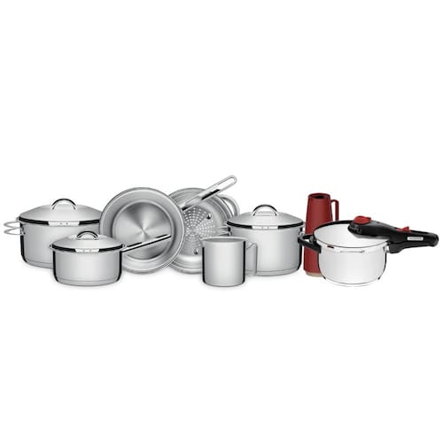 Nada como produtos duráveis e práticos na nossa cozinha. Com o Jogo de Panelas Tramontina Solar em Aço Inox com Fundo Triplo e Tampas de Inox 7 Peças você vai ter peças funcionais perfeitas para auxiliar você nas tarefas do dia a dia. Totalmente produzidas em aço inox, as cinco peças mantém os alimentos saudáveis já que o material não solta resíduos. Trazem ainda a tecnologia de fundo triplo (aço inox + alumínio + aço inox) que distribui o calor uniformemente, proporcionando um cozimento mais rápido e uniforme, economizando energia e deixando os alimentos aquecidos por mais tempo. São peças versáteis que podem ir ao forno para gratinar ou finalizar pratos na temperatura máxima de 260C e ser utilizadas em diferentes tipos de fogões. São fáceis de limpar devido ao desenho sem cantos, além de poderem ir à máquina de lavar louças diariamente. Além disso, levam mais estiloso para dentro da sua cozinha já que apresentam um moderno acabamento em alto brilho. Acompanham tampas com saída de vapor e encaixe perfeito. Garanta uma cozinha completa com esse jogo de panelas clássico da Tramontina!