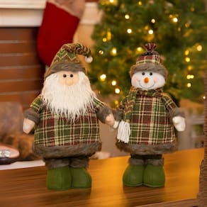 Deixe sua decoração natalina mais charmosa com o Boneco de Neve em pé em pelúcia premium, vestido com roupa, gorro e cachecol estilo crochê em padrão xadrez verde. Um enfeite encantador que une delicadeza e sofisticação, ideal para quem busca destaque e aconchego na decoração de Natal.