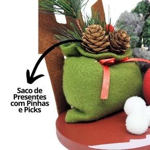-01 Unidade Papai Noel Pelúcia Natal na Cerca Base Madeira 23cm Saco de Presentes decorado Pinhas e Pick