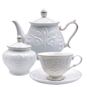 Elegância Duradoura: São peças finas na cor branca, enriquecidas com detalhes em dourado e relevos muito elegantes. Cada xícara e pires foi cuidadosamente desenhado para oferecer uma experiência visualmente deslumbrante, tornando qualquer reunião ou celebração ainda mais especial.