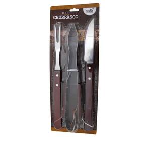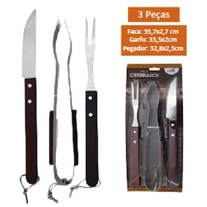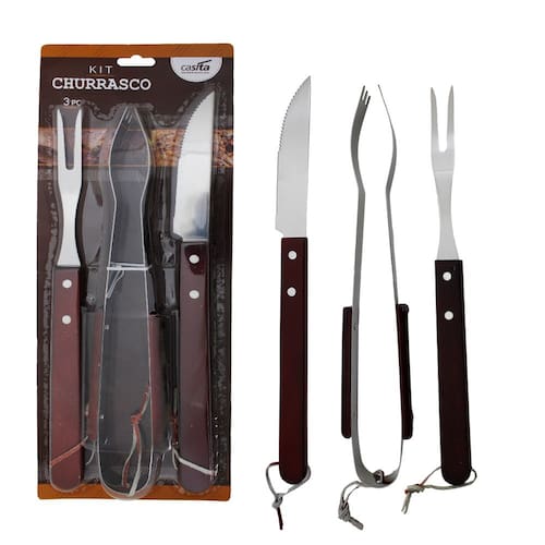 Jogo Para Churrasco 3 Peças Aço Inox Com Cabo De MadeiraPARA O MELHOR CHURRASCO!. O kit para churrasco com 3 peças, da Casita, foi desenvolvido para atender desde o público profissional na churrasqueiro à aqueles que querem começar a se aventurar. Seu acabamento de madeira com aço inox entraga um lindo design, sendo capaz de deixar o seu cantinho do churrasco meu mais chamativo. Convide seus amigos para fazer um belo churrasco!MATERIAIS DE ALTÍSSIMA QUALIDADE!. Seu cabo ergonômico em madeira, facilita seu manuseio e acrescenta estilo e beleza a sua mesa, já sua parte em Inox é ideal para quem busca nobreza, sofisticação e uma qualidade superior.DURÁVEIS!. Sua parte frontal é 100% reciclável e possui excelente durabilidade, sendo a melhor relação custo x beneficio do mercado, além dos itens serem fáceis de limpar e podem ir a máquina de lavar!ITENS INCLUSOS NO KIT:. GARFO TRINCHANTE: O garfo trinchante é uma ferramenta indispensável para todo bom churrasqueiro. Cortar com ele transmite muito mais segurança e praticidade;. FACA PARA CHURRASCO: As facas para churrasco possuem um cabo mais longo, o que proporciona uma pegada melhor, além de mais facilidade e segurança durante o corte da carne;. PEGADOR PARA CHURRASCO: O pegador para churrasco torna muito mais fácil preparar um delicioso churrasco. Com ele você vira, transporta ou manuseia a carne com muito mais facilidade.ESPECIFICAÇÕES:. Material: Madeira e Aço Inox;. Marca:Casita;DIMENSÕES:. Garfo: 35 cm;. Pegador : 35 cm;. Faca: 37 cm;