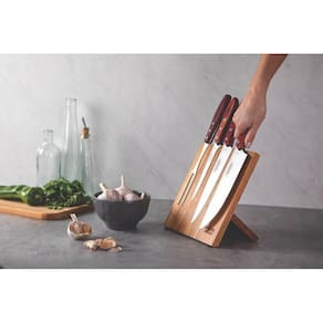 Jogo para Churrasco Tramontina com Lâminas em Aço Inox e Cabos em Madeira Polywood Vermelho 5 Peças Lâminas de aço inox.As lâminas das facas têm maior durabilidade do fio devido ao tratamento térmico.A lâmina do garfo conta com maior espessura e uma estampagem do aço que garante maior resistência, evitando deformações.Os cabos de madeira tratada Polywood são resistentes à impactos e alta temperaturas garantindo maior resistência e durabilidade. Rebites de alumínio. Suporte de madeira magnético. Podem ir à máquina de lavar louças facilitando seu dia a dia.