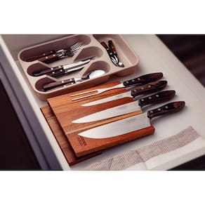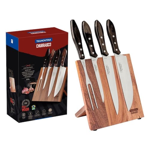 Mais Informações - Lâminas de aço inox.As lâminas das facas têm maior durabilidade do fio devido ao tratamento térmico.A lâmina do garfo conta com maior espessura e uma estampagem do aço que garante maior resistência, evitando deformações.Os cabos de madeira tratada Polywood são resistentes à impactos e alta temperaturas garantindo maior resistência e durabilidade.Rebites de alumínio.Suporte de madeira magnético.Podem ir à máquina de lavar louças facilitando seu dia a dia.