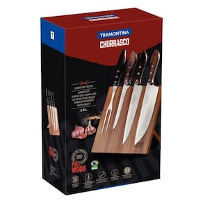 Recomendação de Uso - Prepare seus melhores churrascos com mais estilo e praticidade, com o jogo para churrasco Tramontina com lâminas em aço inox e cabos em madeira polywood castanho 5 peças. Perfeito para cortar e servir os melhores cortes de carnes, o jogo conta com facas para carne, faca para desossa, garfo trinchante e cepo magnético, todos esses, utensílios essenciais para preparar e servir um bom churrasco. As peças possuem lâminas em aço inox e cabos são em madeira polywood tratada, ambas características que o tornam um jogo de alta qualidade e resistência. Ele não pode faltar em sua casa!