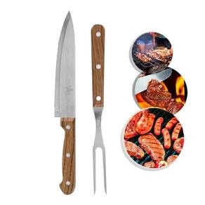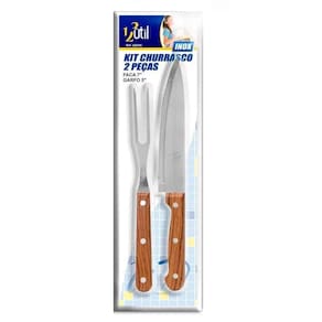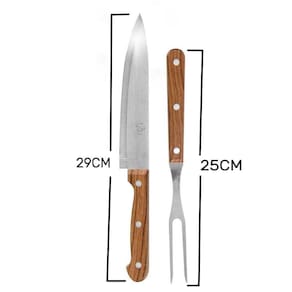 Especificações: - Contém: 2 Unidades: 1 Faca 1 Garfo - Material em aço inox com cabo madeira de alta resistência - Medidas Aproximada: Garfo 25cm / Faca 29cm