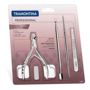 Jogo Para ículas E Pinça Tramontina Em Aço Inox 4 Peças Cuide da sua autoestima com o Jogo para ículas e Pinça Tramontina em Aço Inox 4 Peças. Um kit com quatro peças em aço inox, perfeitas para serem levadas sempre com você! O empurrador/raspador e alicate para ículas, palito e pinça, possuem características antideslizantes e design ergonômico que facilitam o manuseio e tornam seu uso muito mais prático e confortável. Todas as peças são esterilizáveis em autoclave, garantindo itens livres de bactérias. Com esse kit, fazer suas unhas e tirar aqueles pelinhos indesejados ficou muito melhor e mais fácil! Recomendações de Uso: - Antes da primeira utilização e após cada uso, lave as peças com água, sabão neutro e seque e/ou esterilize em autoclave.- Após o preparo das ículas, empurre com cuidado o excesso de pele no topo das unhas, raspe com a ponta indicada e remova com o alicate.- Utilize a ponta lisa do palito para remover o excesso de esmalte e a ponta com ranhuras, para limpar o esmalte que ficou sobre a pele com auxílio de algodã uso da pinça, selecione os pelos a serem arrancados, segure com firmeza e puxe na direção do crescimento.- Produtos cortantes e perfurantes: tenha cuidado ao manusear e mantenha fora do alcance das crianças.- Evite quedas, pois danifica os produtos.- Após o uso guarde o alicate com a capa de proteção do fio.- Para descarte de produtos e embalagem siga as orientações de reciclagem vigentes. Informações Adicionais: