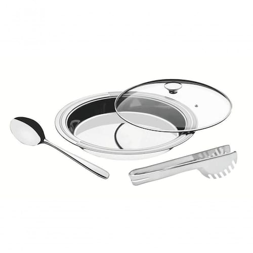 - Utensílio totalmente feito em aço inox, altamente durável e de fácil limpeza.- Proporciona um requinte ao compor a mesa.- Peça com acabamento do aço em brilho e detalhes em alto relevo fosco nas bordas, própria para o uso diário, combinando com qualquer ambiente.- Possui Tampa de vidro temperado. Ean: 7891116083116