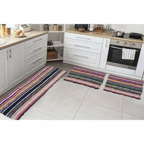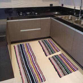 Principais Características:- Kit com 3 peças: 2 tapetes de 28x50 cm + 1 passadeira de 28x100 cm- Estilo rústico mexicano: visual autêntico com listras vivas e cheias de energia- Feito à mão: corte e costura artesanais- Multifuncional: ideal para cozinha, lavanderia, varanda ou área gourmet