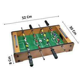 Pronto para desfrutar ao máximo os seus momentos de lazer? Este pebolim é o parceiro perfeito para você brincar e se divertir com sua família ou amigos, na escola, em casa, no trabalho ou em qualquer lugar. Coloque-o onde quiser e não deixe o jogo parar! Mini Jogo de Mesa Pebolim Portátil Totó Super Craque Junior, garante toda a diversão do Pebolim em uma versão compacta para você levar para onde quiser! Basta colocar em uma superfície plana e se divertir! A mesa possui 4 fileiras de jogadores, totalizando 12 bonecos, isso inclui um goleiro de cada lado que tem camisetas de cores diferentes. Acompanha duas bolas, e placar manual deslizante para manter a pontuação. É construída com um belo acabamento de verniz em madeira MDF de alta resistência.Um produto para todas as idades, ideal para presentear ou curtir com os amigos! CARACTERÍSTICAS TÉCNICAS Conteúdo da Embalagem: 1 Mini mesa de Totó, 2 Bolas. Dimensões da Aproximadas da Embalagem: 9 x 30 x 52cm (Altura x Largura x Comprimento) Material/Composição: Madeira Idade Mínima Recomendada: Recomendável para maiores de 6 Anos de Idade. Participantes: 2 participantes Alimentação: Não se Aplica. Outras informações: Não Recomendável para Menores de 3 Anos de Idade. Aviso: As informações e imagens divulgadas são de total responsabilidade do fabricante/fornecedor.