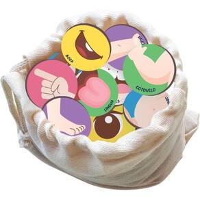 A criança sorteia uma peça no saquinho de tecido, identifica a parte em seu próprio corpo e a posiciona sobre o boneco de madeira. Acompanha cartinhas com curiosidades, que também podem ser usadas como um jogo da memória: peça + cartinha correspondente.