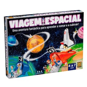 Jogo Pedagógico Viagem Espacial - Grow Pronto para embarcar em uma aventura pelo espaço sideral e pela matemática? O Viagem Espacial é um jogo de tabuleiro perfeito para você e sua família. Faça uma viagem pela galáxia neste jogo educativo levando passageiros e mostrando que entende tudo de adição e subtração. Quem conseguir chegar até o final com mais passageiros, ganha. Exercite com a criançada os conhecimentos de matemática e conte com uma ajudinha da sorte para ser o vencedor! Como jogar Viagem Espacial? O Viagem Espacial é um jogo para crianças de 4 a 7 anos, e precisa ter entre 2 e 4 participantes. O objetivo é chegar ao final do tabuleiro com o maior número de passageiros. Para isso, você precisa jogar um dado para definir em qual planeta sua nave vai chegar. Após parar, jogue o dado novamente para definir quantos passageiros devem sair ou entrar em seu foguete. Se cair no símbolo de mais, adicione o número de passageiros que o dado mandar. Se cair no símbolo de menos, então é hora do desembarque! Fácil, divertido e educativo, este jogo de tabuleiro vai ajudar seus filhos a aprenderem matemática brincando! Idade: De 4 a 7 anos Participantes: 2 a 4 Jogadores Tempo estimado de jogo: 30 minutos Código: 080917 Dimensões aprox. da embalagem em cm: 31x23,5x4 Peso liq. Aproximado do produto na embalagem: 396g Referência do Modelo: 04057 Certificado Inmetro: Sim Conteúdo da Embalagem: 1 tabuleiro, 1 dado, 40 cartelas de passageiros, 4 peões-foguete, 4 cartelas de foguete, 4 suportes, 1 regra. Composição/material: Cartonado Idade recomendada: a partir de 4 anos Garantia: 90 dias contra defeitos de fabricação pelo fabricante Imagens meramente ilustrativas. As cores e tonalidades podem variar. Gênero - Meninas Meninos Unissex Idade - 4 anos 5 anos 6 anos 7 anos Tipo - Jogo de Tabuleiro Jogo Pedagógico Ean: 7908010140576