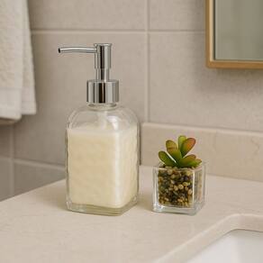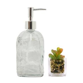 Conjunto para Banheiro em Vidro Texturizado Clear Geométrico – Porta Sabonete Líquido 500ml + Mini Vaso Decorativo com Suculenta Artificial