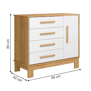 A cômoda é feita em MDP 15mm, possuindo quatro gavetas com corrediças metálicas, uma porta e seis prateleiras com amplo espaço para organizar sapatos e roupas.