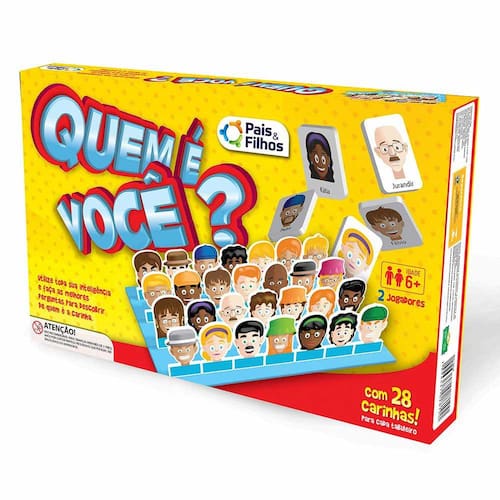 No Jogo Quem é Você? - 56 Carinhas - Pais e Filhos você tem que utilizar toda sua inteligência e fazer as melhores perguntas para descobrir de quem é a carinha! Faça as perguntas certas e elimine os suspeitos, pois o procurado pode ser qualquer um. Seja com quem for a brincadeira, esta disputa pode divertir qualquer pessoa a qualquer momento. Suporte em E.V.A e carinhas divertidas são alguns dos atrativos deste jogo. INFORMAÇÕES: • Produto: Quem é você? • Tipo: Jogo de Adivinhação • Marca: Pais e Filhos • Embalagem: 36,6 cm x 23,3 cm x 4,5 cm • Peso da embalagem: 0,582 gramas • Conteúdo 56 Carinhas em Papel, 28 Cartinhas e 2 Suportes em E.V.A. • Certificado: CE-BRI/ICEPEX-l 01883-25 NBR NM 300/2004 • Composição / Material: Papel Cartão • Idade Recomendada: para crianças a partir de 6 anos de idade AVISO: • As imagens são meramente ilustrativas. As cores e estampas dos produtos podem ter variações. As informações são de responsabilidade do fabricante ou fornecedor. ATENÇÃO: • Agora você sabe onde comprar Jogo Quem é Você? - Pais e Filhos. Aproveite nossas condições de pagamento. Entrega para todo o Brasil. Oferta válida por tempo indeterminado. Produto sujeito a disponibilidade de estoque.